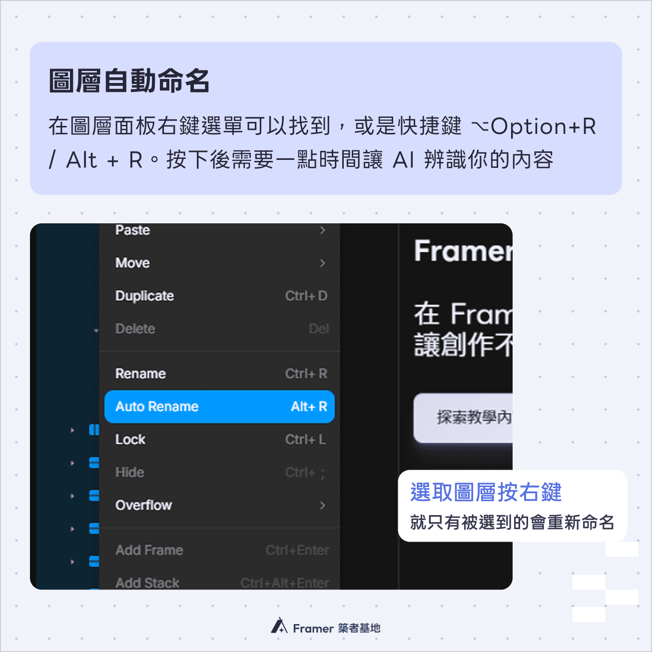 圖層命名清楚,可以大幅提升辨識與操作速度,但手動命名非常耗費時間。這時可以善用 Framer 的「圖層自動命名」功能。可以在 Layers 面板中按右鍵選單找到,也可以選取圖層後,按快捷鍵 ⌥ Option + R / Alt + R,快速為圖層命名,減少整理圖層的時間成本。