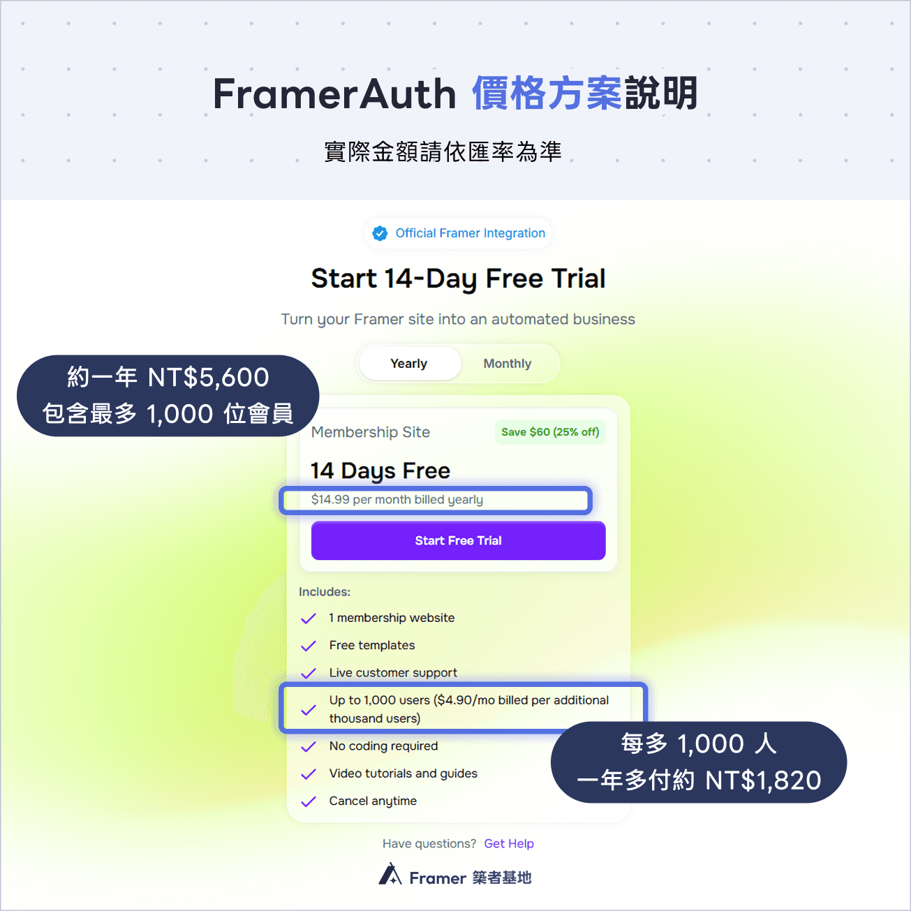 最後來說說大家最關心的方案價格。FramerAuth 提供 14 天免費試用,可以在不付費的情況下完整測試會員註冊、登入與會員頁面限制等功能。