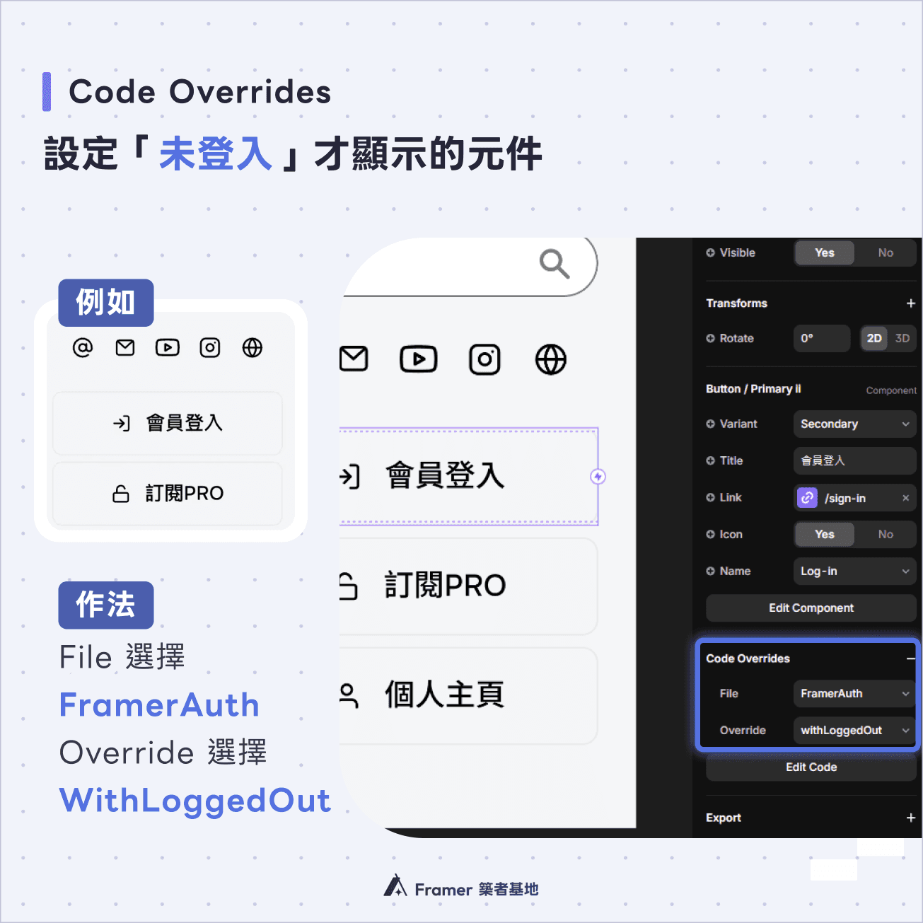 在 Framer 中,你可以針對單一元件設定是否要依登入狀態顯示,例如未登入的話會顯示「會員登入」,已登入的話會顯示「個人主頁」,步驟如下: