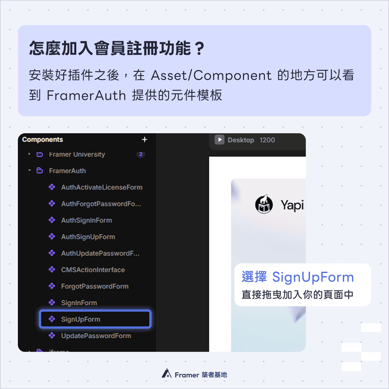 首先到 FramerAuth 官網購買方案(文章最後有價格方案說明),接著點擊官網的 Add To Framer 按鈕,依照步驟指示將 FramerAuth 插件連結到專案中。完成後,你會在 Framer 的 Assets / Components 中,看到 FramerAuth 提供的元件模板。