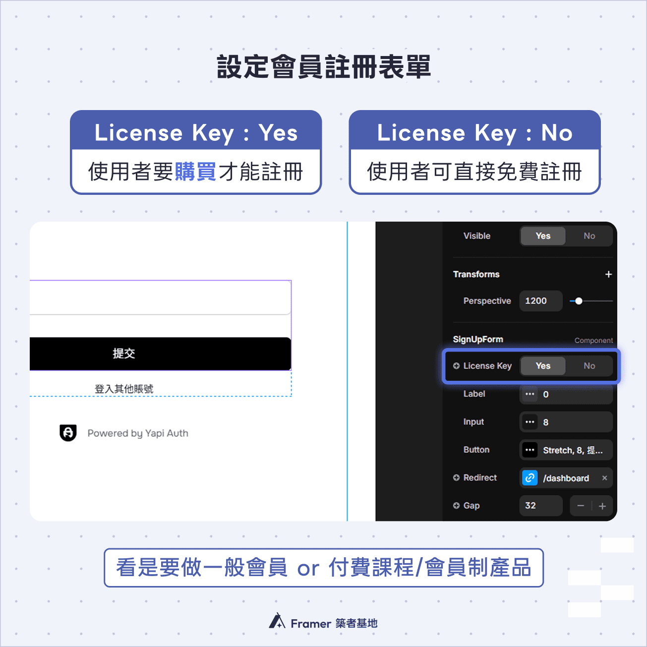 在元件列表中選擇 SignUpForm,拖曳加入你的 Framer 網頁中,就可以快速建立一個會員註冊表單頁面。這個表單可以依需求設定是否需要「授權碼(License Key)」: