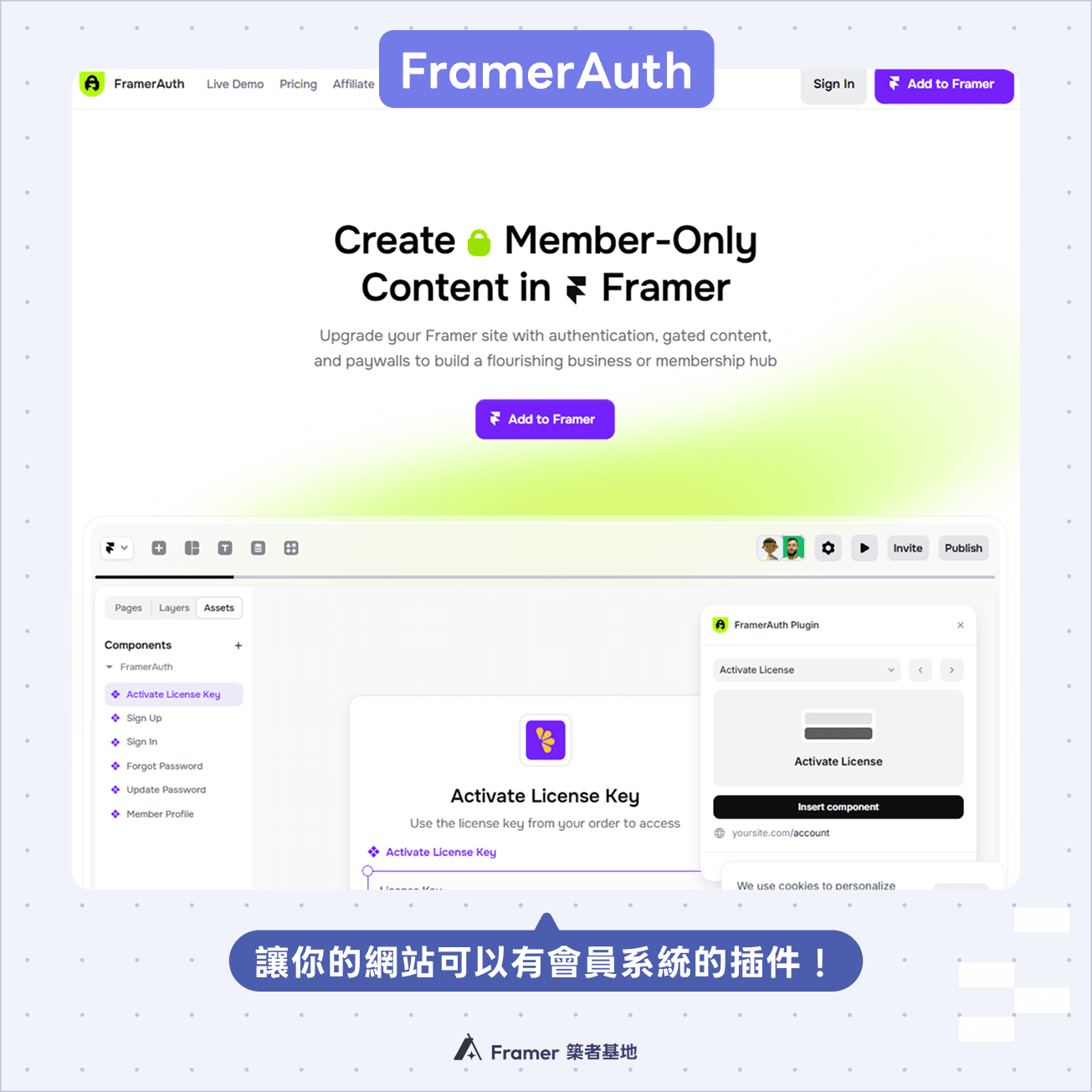 FramerAuth 是一個專門為 Framer 設計的會員驗證工具,可以協助你快速完成: