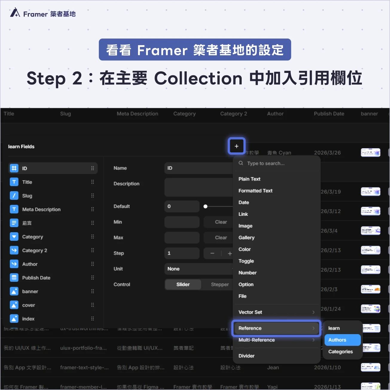 點選「+」後,找到引用 (Reference),接著選擇剛剛建立好的,名為「Authors」的 Collection。