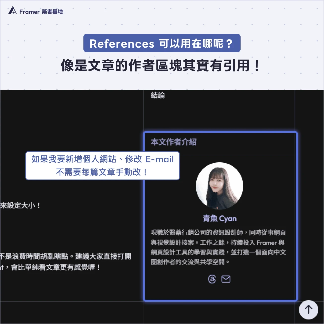 其實 Framer 築者基地就是這樣典型的案例!我們有好多位作者,然後還會在文章側邊呈現作者的簡短介紹以及相關連結。假設要修改其中一個網址,一篇一篇改的話會很沒有效率!