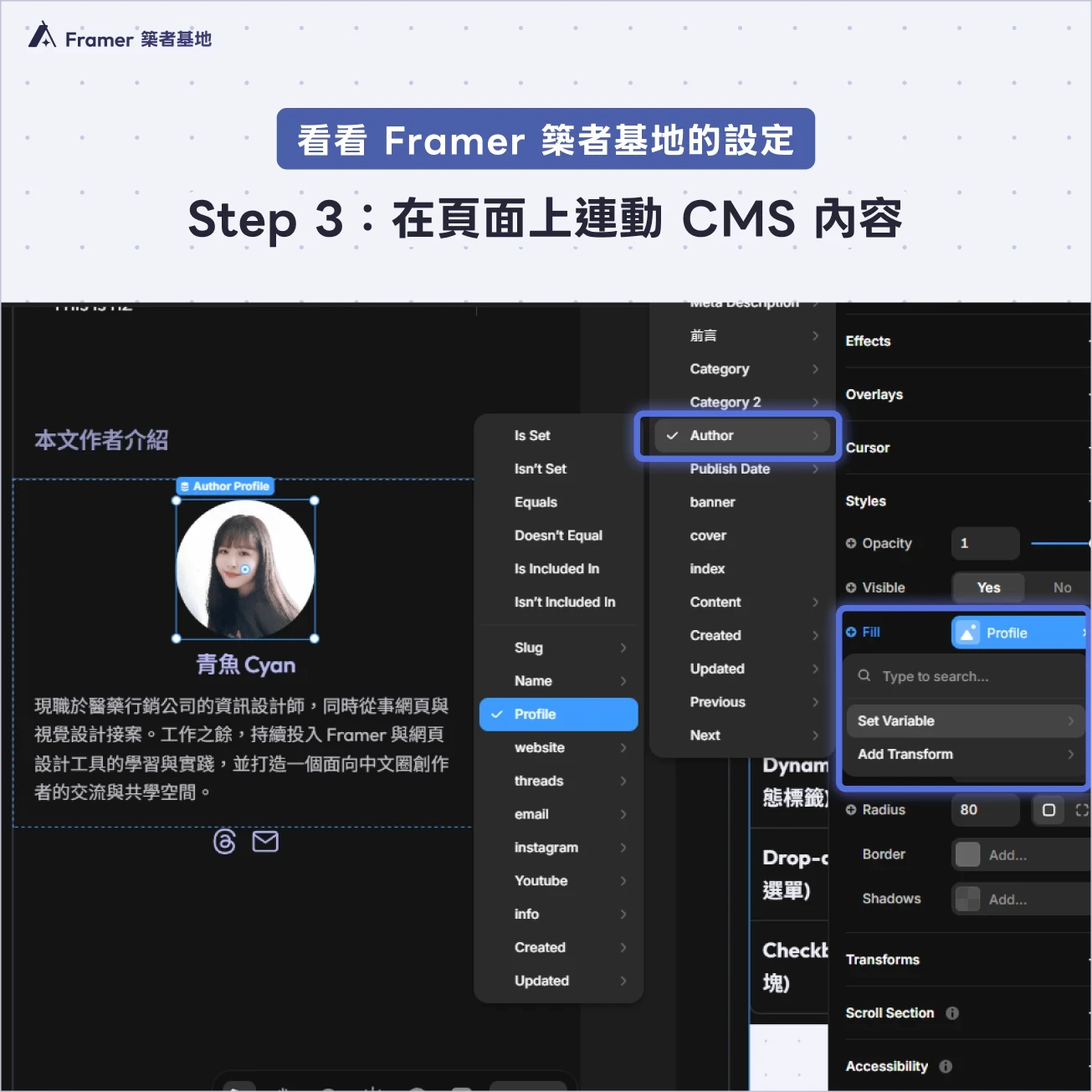 接著回到你的文章預覽頁面。我們先前已經做好作者的樣式了,最後一步就是要讓裡面的資料都可以自動同步!這部分的原理其實跟引用 CMS 內容時的步驟一樣,都是透過 Set Variable 來連結,我們以作者的頭像照片區來舉例: