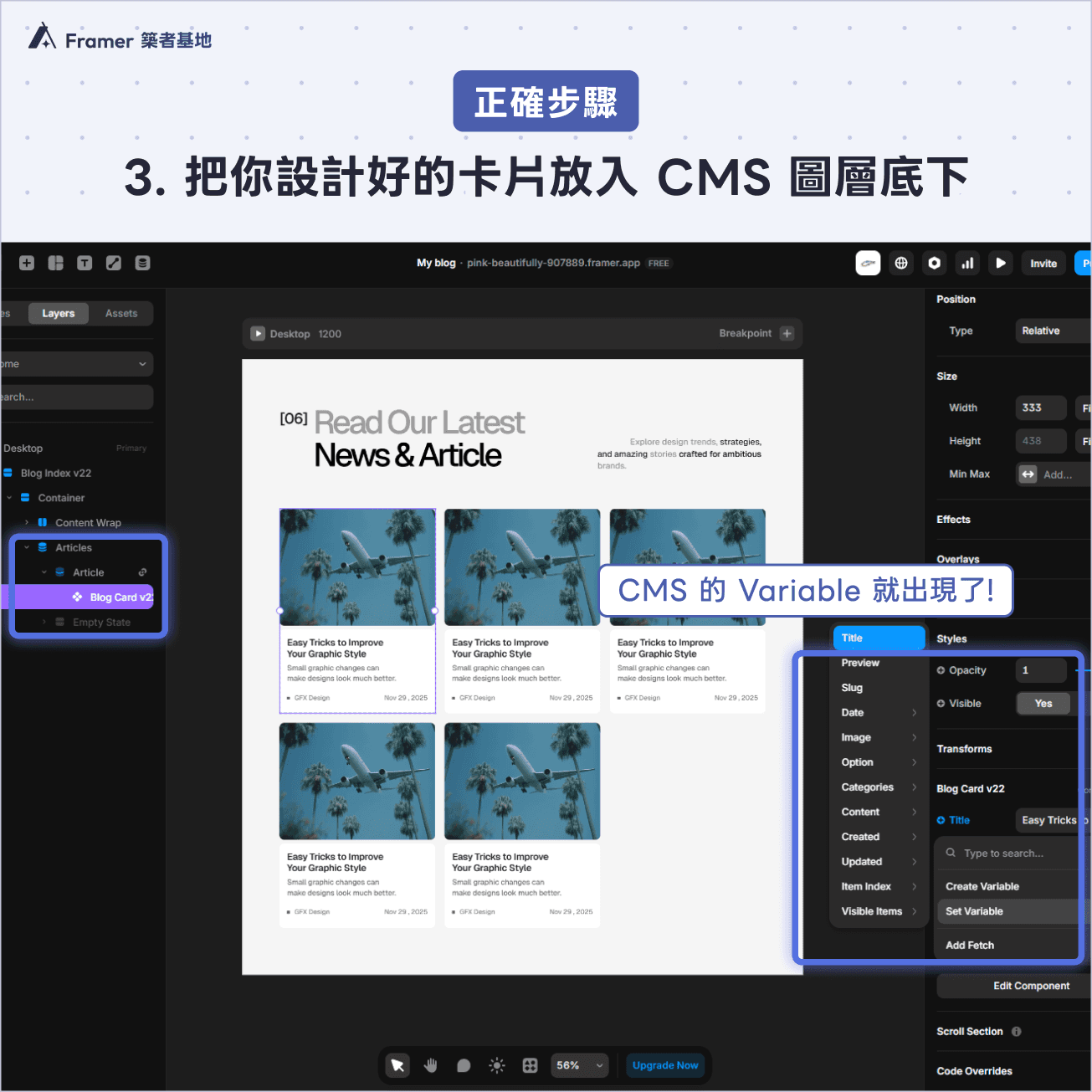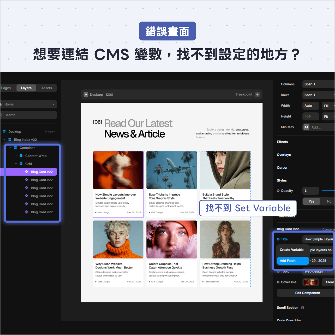 這是很多新手容易卡住的地方:若是沒有將 CMS 放入畫布的圖層結構中,就會沒辦法連結變數(如上圖)。跟著以下的步驟放入,就可以連結變數了,跟著試試看吧!