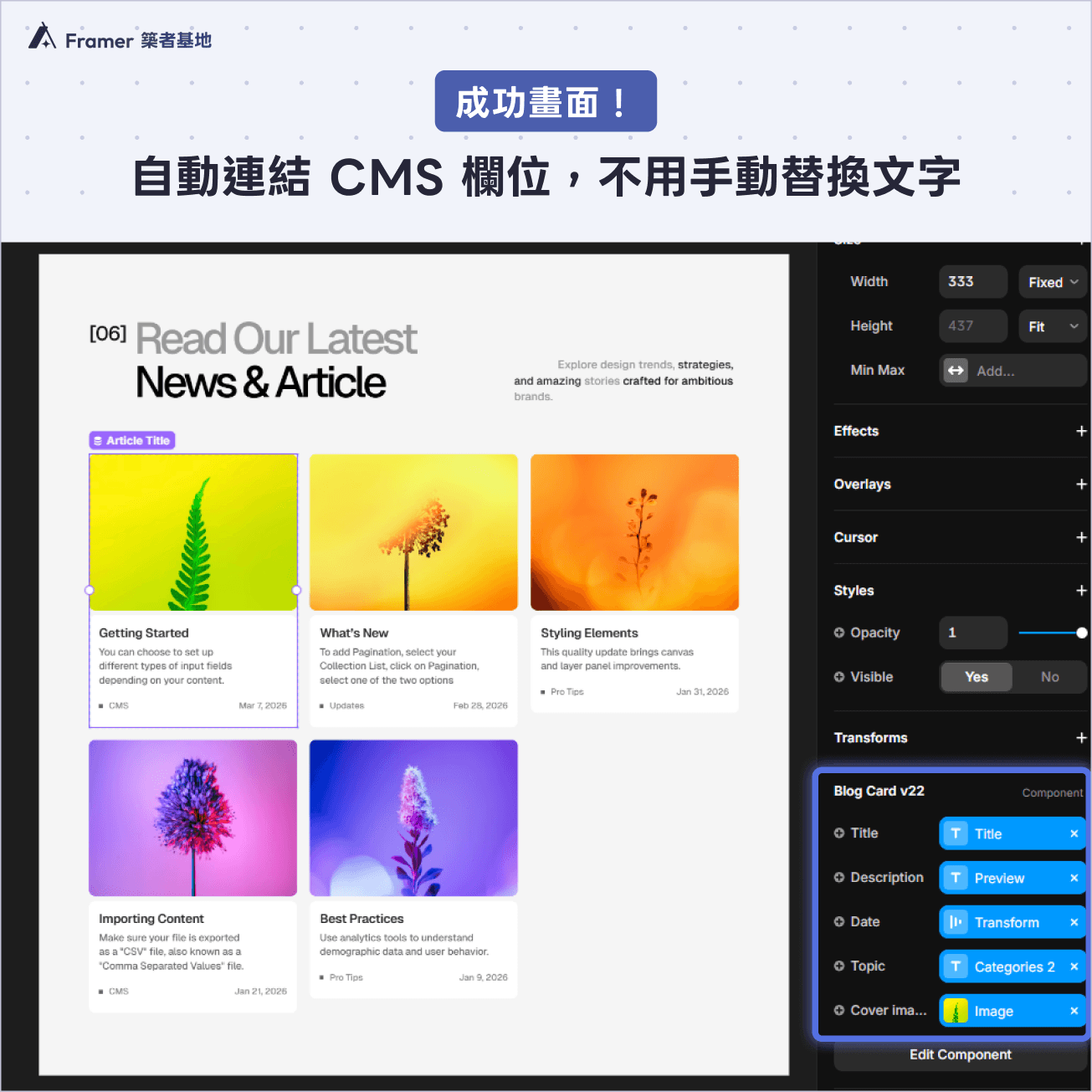 一一連結起來,卡片就會自動套用好 CMS 的欄位,變成一個列表!這樣如果有修改 CMS 內容,這邊的列表內容也會自動更新。
