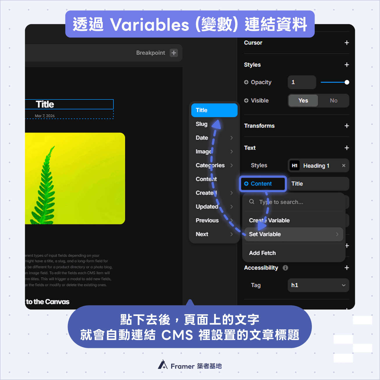 選擇「Set Variable (設定變數)」,然後挑選你要串接的 CMS 欄位(例如:Title 或 Banner)。