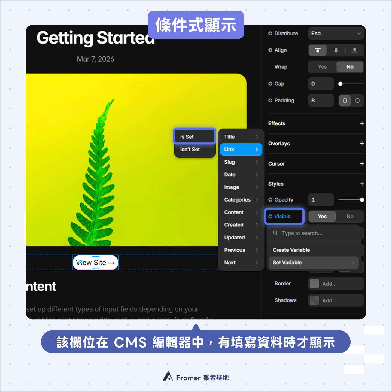 我們可以在樣式面板 (Styles panel) 中,針對按鈕的「Visible (可見度)」屬性設定變數。 選擇該連結欄位,並將變數條件設定為「Is Set (已設定)」。 這樣一來,Framer 就只會在該欄位有填寫資料時才顯示按鈕,如果沒填寫,按鈕就會自動隱藏,讓排版保持乾淨。這個邏輯也可以套用在其他類似的情境:例如在團隊成員列表中,通常會放上該成員的各種社群 icon。但不是每個人都有所有的社群帳號。此時可以設定若 CMS 裡面沒有放入某個社群平台的網址,就不顯示該 icon。