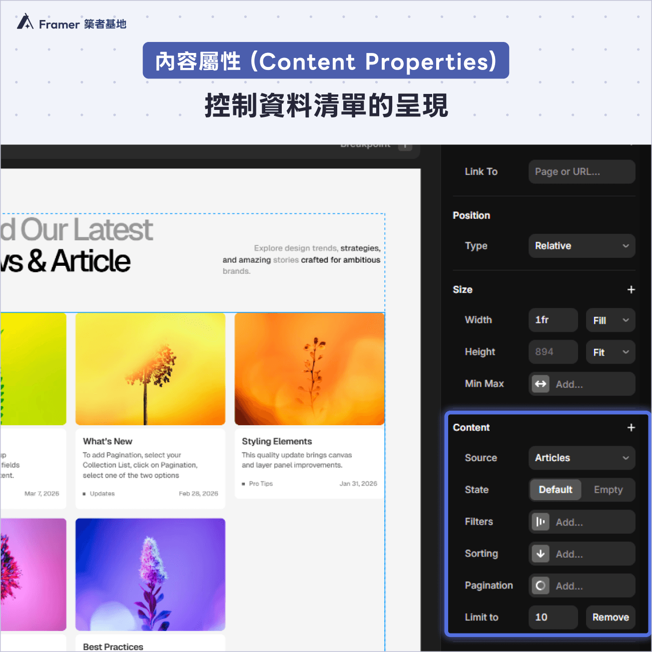 完成列表後,如何再去設定清單顯示的內容呢?點選整個 Collection List 後,右側面板會出現內容屬性 (Content properties),能讓你控制資料的呈現方式: