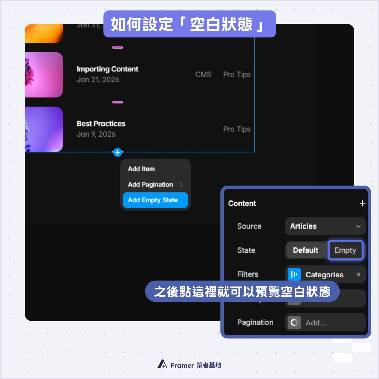 點選你的 CMS Collection List,點擊底部的 「+」 ,選擇「Add Empty State」。Framer 會自動幫你產生一個區塊,可以把中間的 No Items 改成「找不到相關文章」。