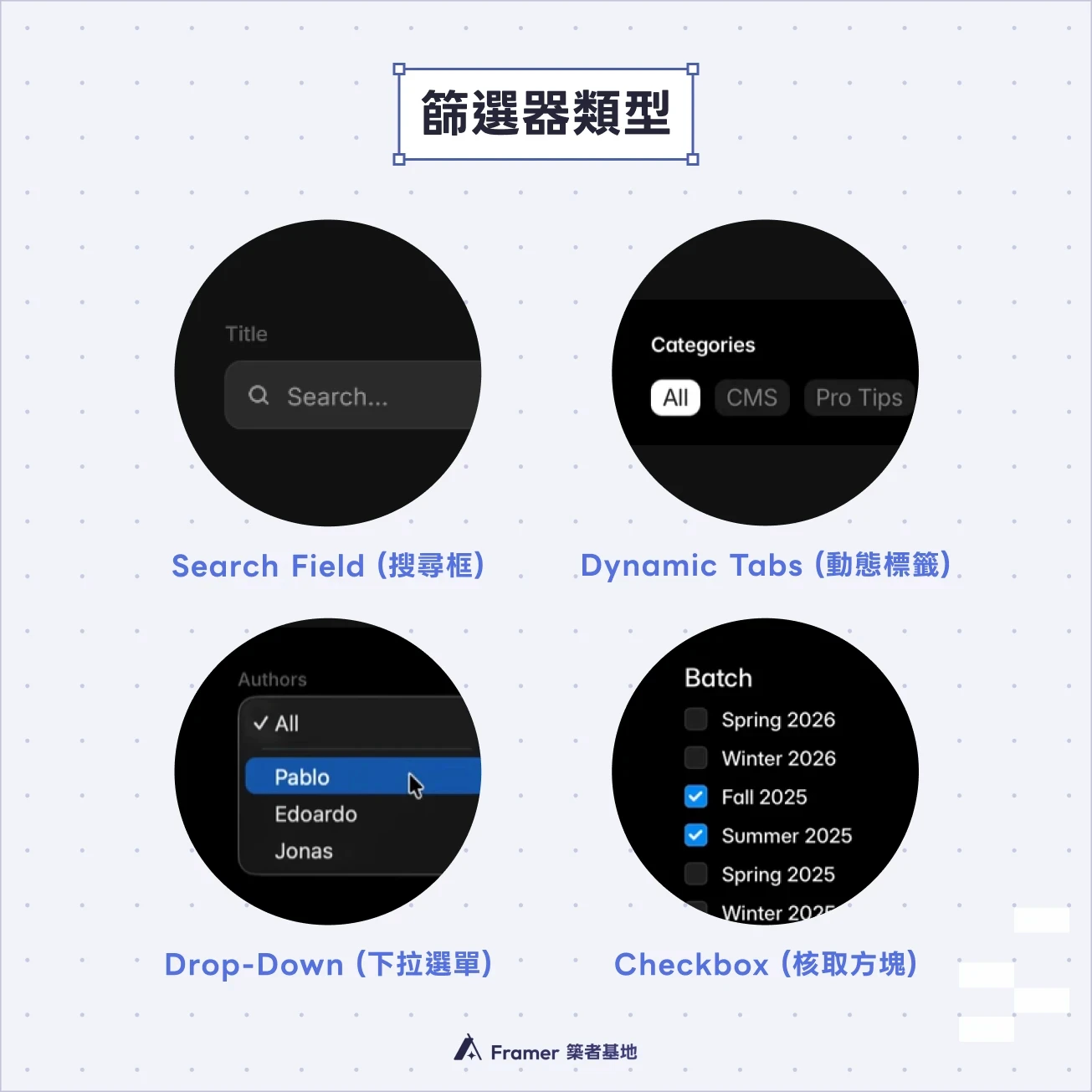 目前 Framer 支援 4 種最常見的篩選元件,你可以依照需求自由搭配:
