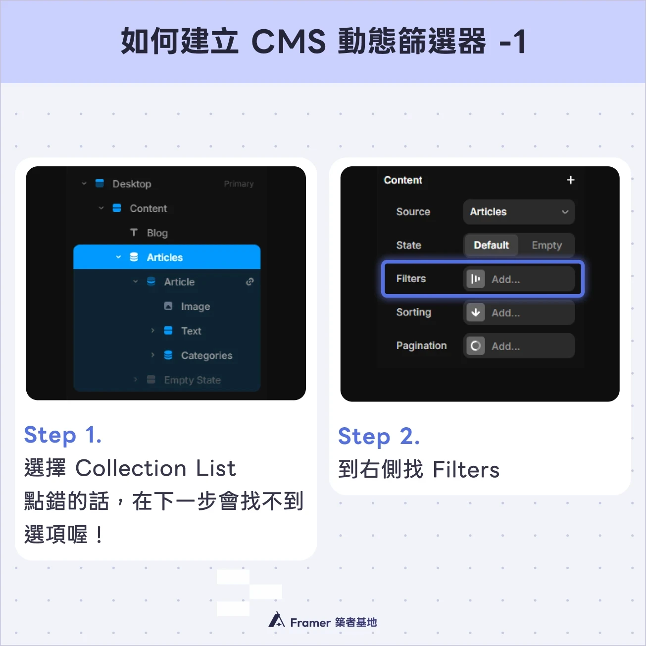 在前兩篇文章中,我們學會了建立資料庫與動態排版。但當你的網站文章越來越多時,訪客可能會很難找到他們想要的內容。而這篇文章的重點,就是要教你如何運用 Framer 動態篩選器 (Dynamic Filters),為網站加上強大的搜尋與分類功能!