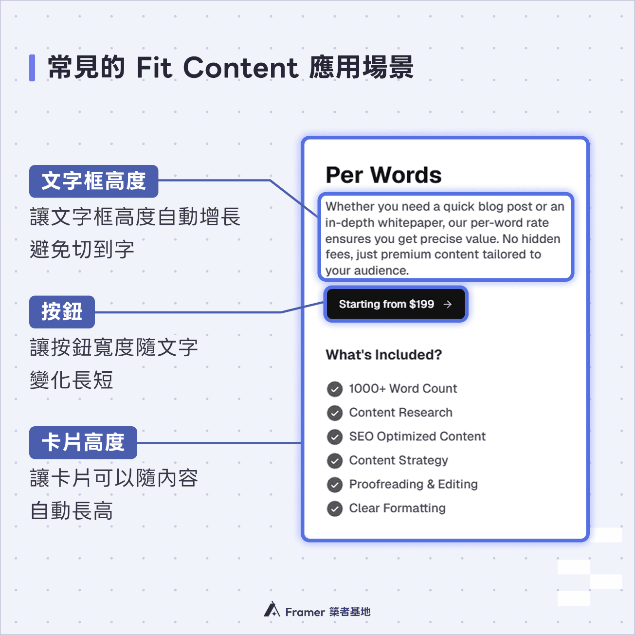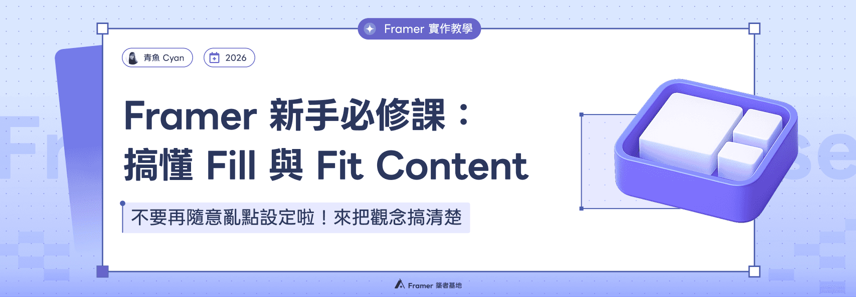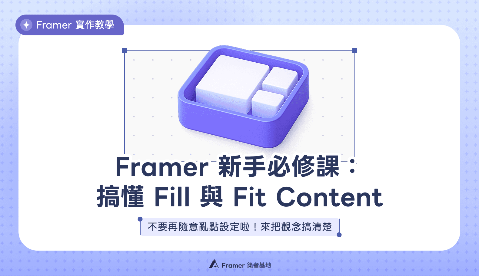 在 RWD 響應式網頁的世界裡,不能總是把尺寸寫死,而是要學會讓容器自己依照螢幕寬度來決定大小。今天這篇學習筆記內容整理自官方 Fundamentals 教學中的《Sizing to Fill and Fit Content in Framer》,將帶大家理解兩個超級關鍵的排版屬性:Fill (填滿) 與 Fit Content (適應內容)。