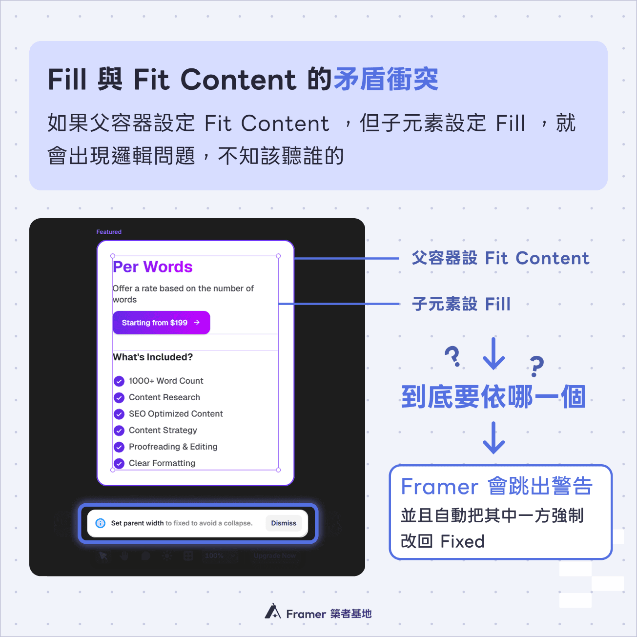 當你試圖這樣設定時,Framer 會為了防止網頁崩潰,自動把其中一方強制改回 Fixed (固定尺寸)。
